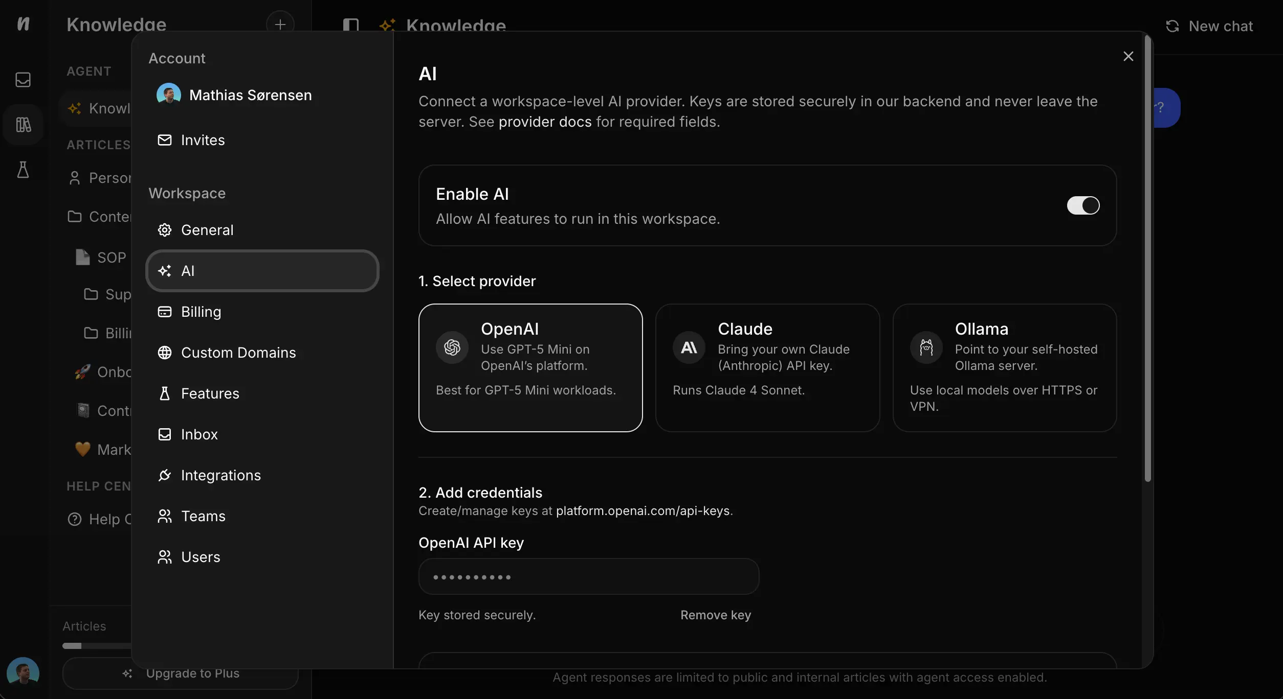 API keys are stored securely and never leave Neuphlo's backend. Use Ollama when you need traffic to stay on your own network, and test every connection before enabling AI across the workspace.